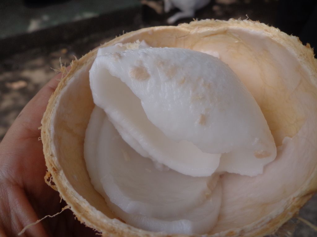 Attirée par un attroupement, je vois un vendeur de petites noix de coco, moyennant 500 colones (moins d'un euro). Il ouvre le sommet pour qu'on puisse boire l'eau avec une paille, puis il les coupe en deux pour décoller la pulpe avec une cuillère.