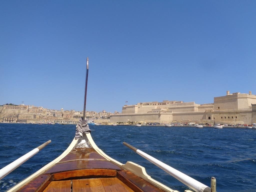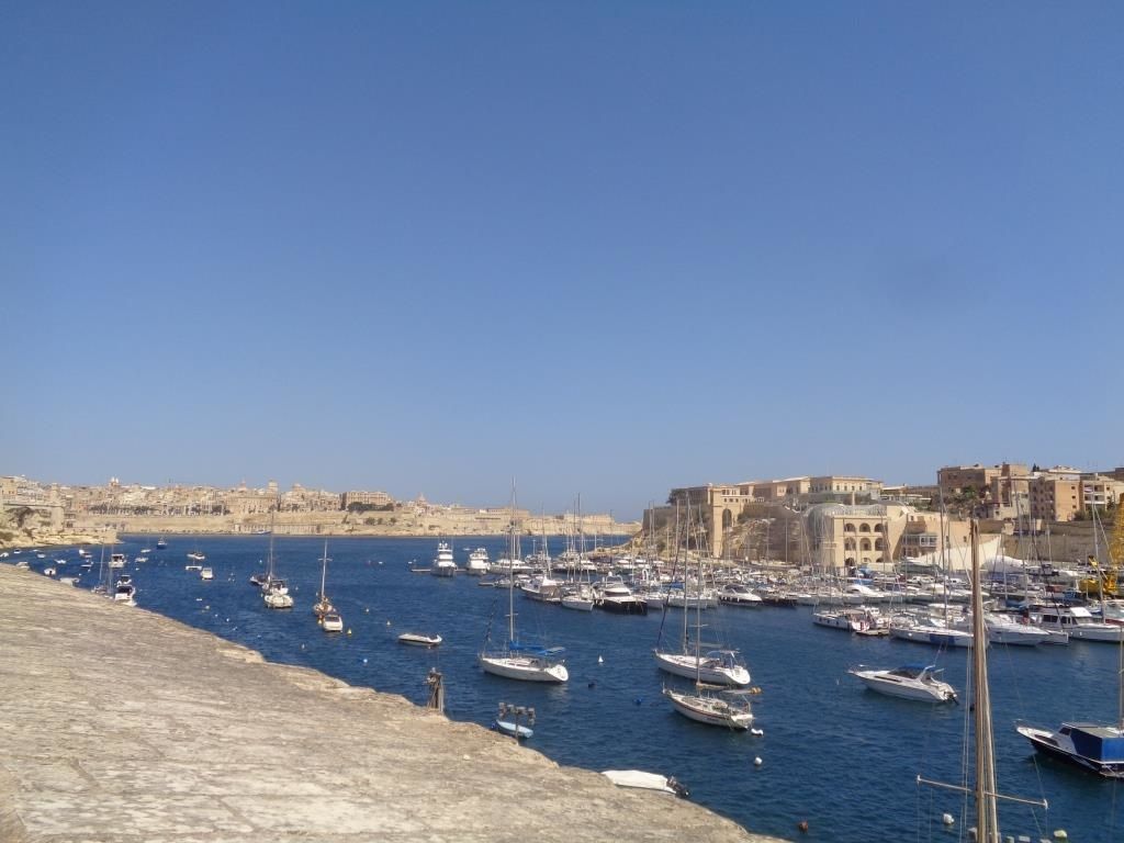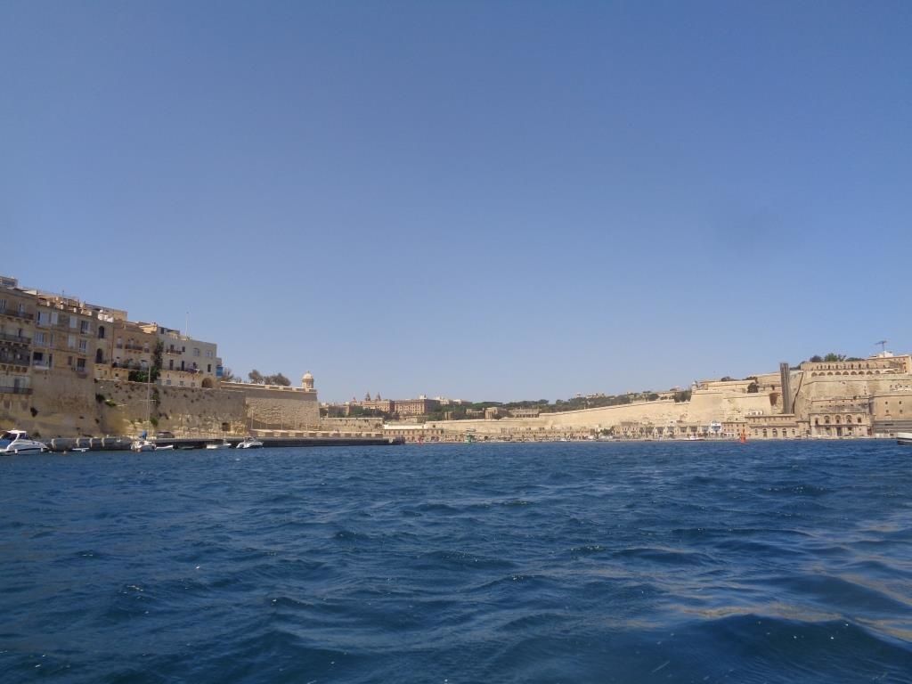 On voit à l'horizon la gadjola de Senglea et la façon dont elle s'avance sur la mer.